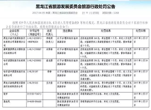 因以不合理低价组织旅游,黑龙江省中旅国际旅行社有限公司革新街分公司、康辉集团黑龙江国际旅行社有限公司、哈尔滨国际旅行社有限公司、哈尔滨中景国际旅行社有限公司、黑龙江省桃源假日国际旅行社有限责任公司,均受到没收违法所得、停业整顿1个月、并处3万元罚款,对直接责任人(导游)罚款2000元的行政处罚。